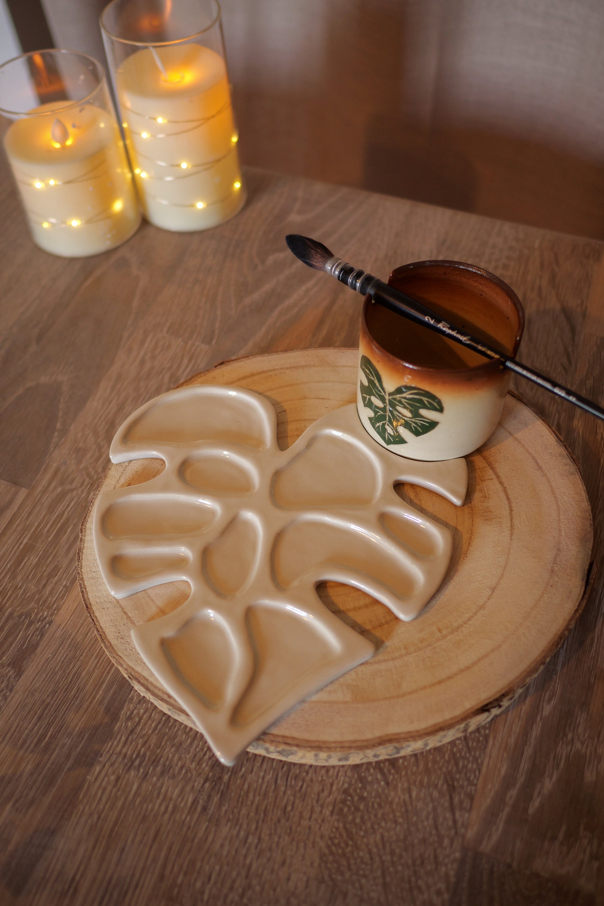 Palette monstera et son pot en grès blanc. Pièces réalisées au tournage et au modelage. La palette est émaillée avec un émail blanc brillant et le pot est émaillé avec un émail transparent.