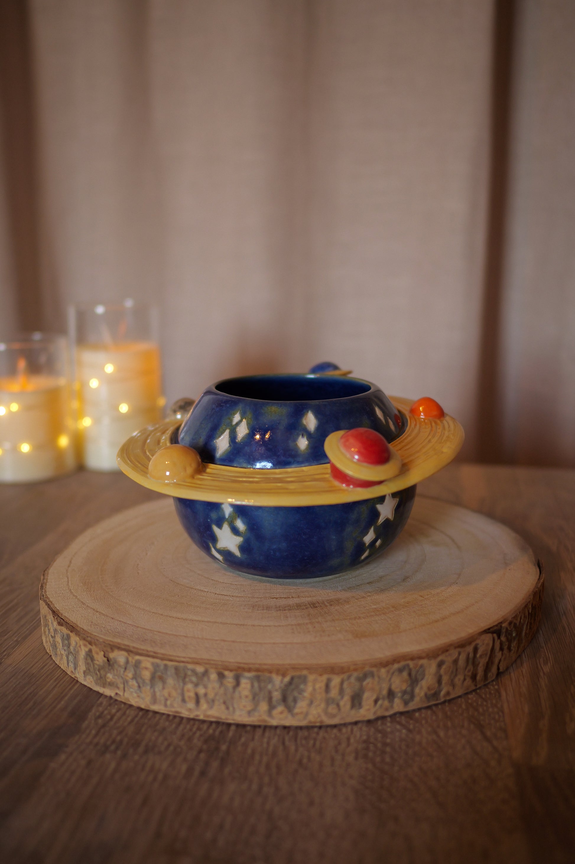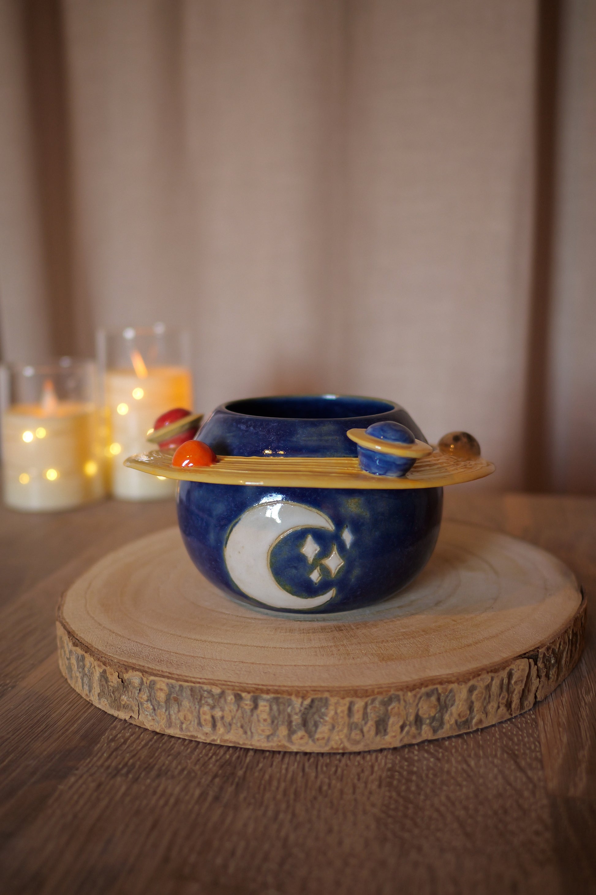 Pot en grès blanc. Pièce réalisée au tournage et au modelage. Le pot est émaillé avec un émail transparent brillant sur l'anneau et un émail bleu sur le corps du pot.